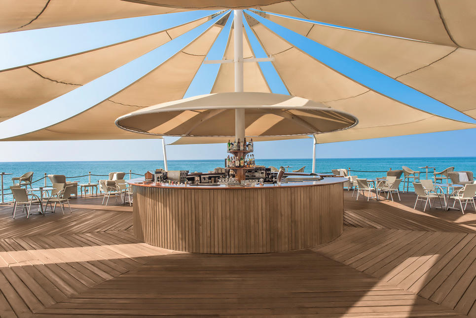plage de sable : chaises longues, parasols, matelas, draps de bain, lits balinais*