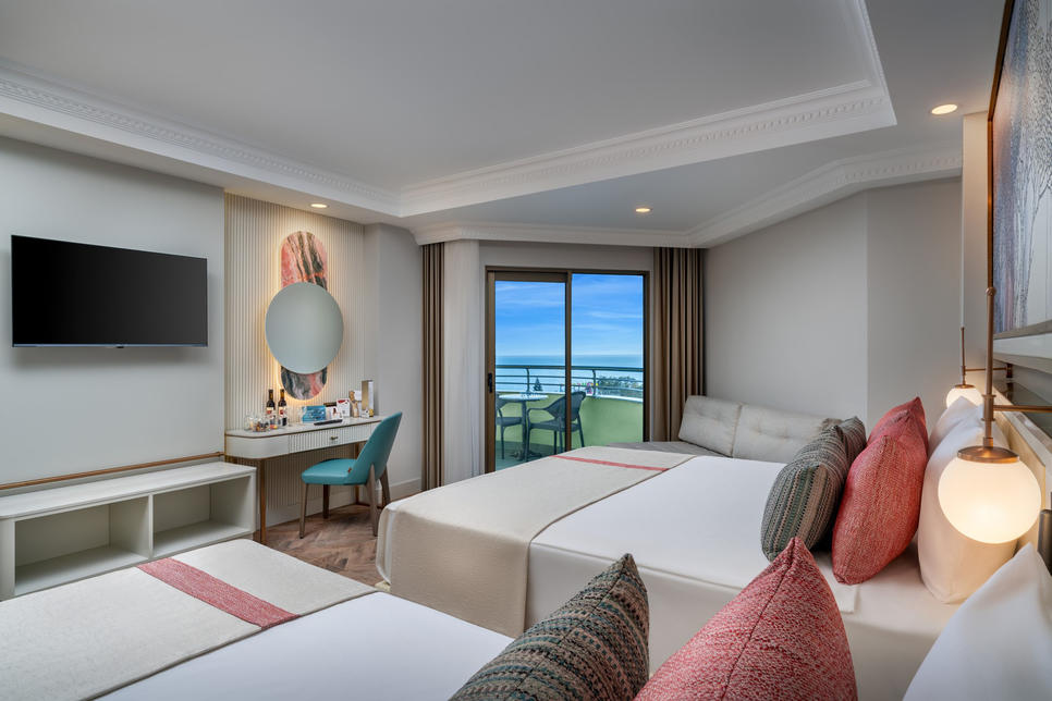 terrasse avec draps de bain, chaises longues, parasols, matelas