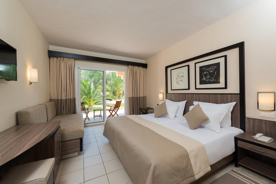 (env. 30 m²), 2 lits individuels ou 1 lit double, 1 coin salon (2 canapés-lits), air conditionné (du 15.06 au 15.09), Wifi, TV, téléphone, coffre-fort*, petit réfrigérateur, chauffage (du 15.11 au 15.03), sèche-cheveux, WC, balcon ou terrasse, vue jardin, bouteille d’eau à l’arrivée.