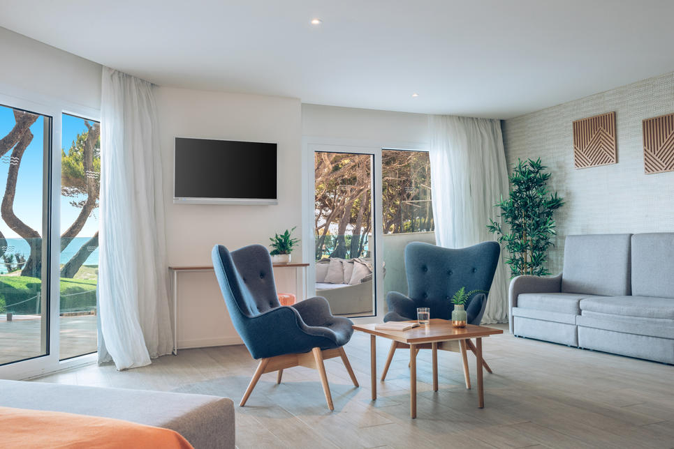 (env. 35-40 m²), 1 chambre (1 lit double ou 2 lits individuels), 1 salon (1 canapé-lit, porte de séparation), air conditionné, minibar*, Wifi, TV, téléphone, coffre-fort*, douche, sèche-cheveux, miroir cosmétique, peignoir, chaussons, draps de bain, WC, balcon, vue mer latérale.
