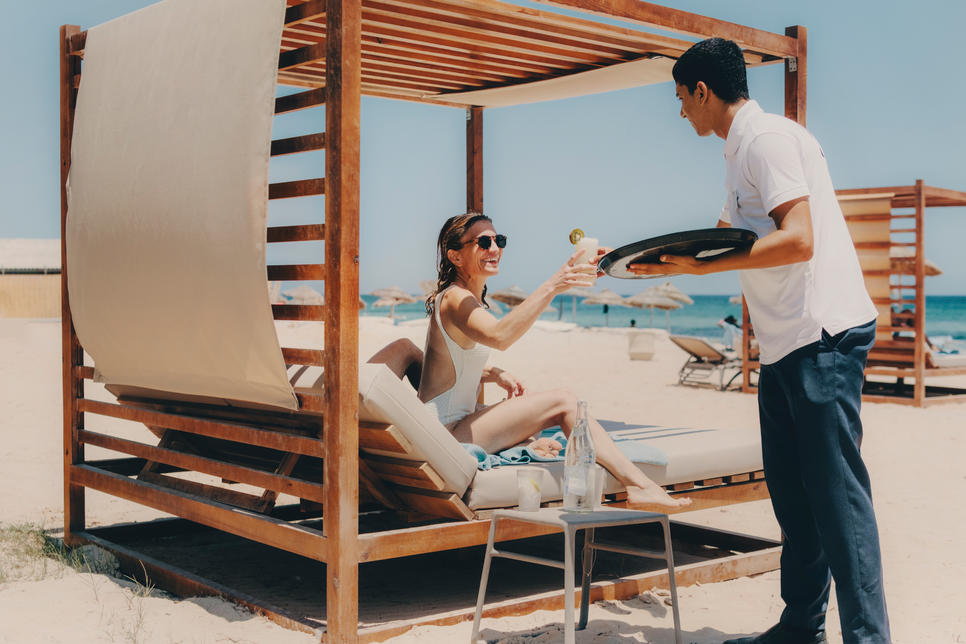 plage de sable privée : chaises longues, parasols, matelas, draps de bain (moyennant caution), lits balinais