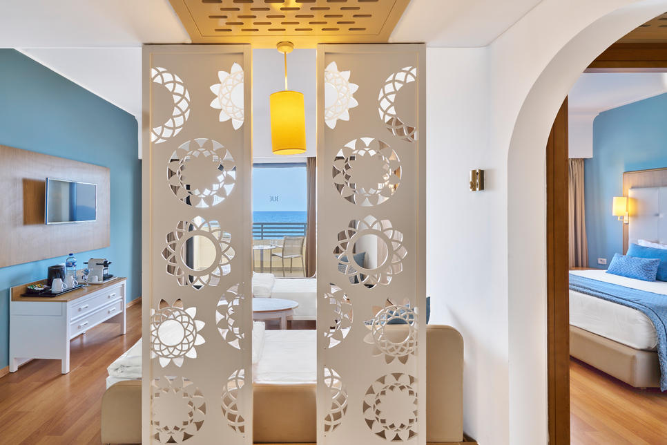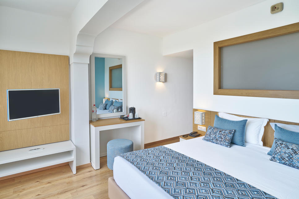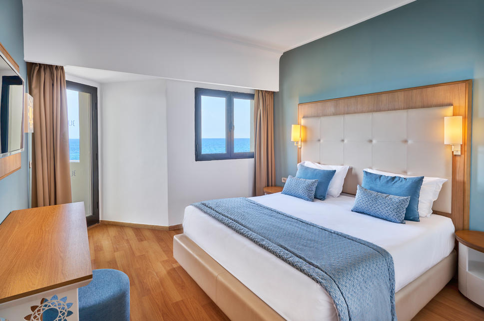 (env. 48 m²), 1 lit double et 2 canapés-lits, air conditionné (en haute saison), réfrigérateur, Wifi, TV, téléphone, coffre-fort, baignoire, sèche-cheveux, WC, balcon, vue mer, changement des serviettes et du linge 3 fois par semaine.