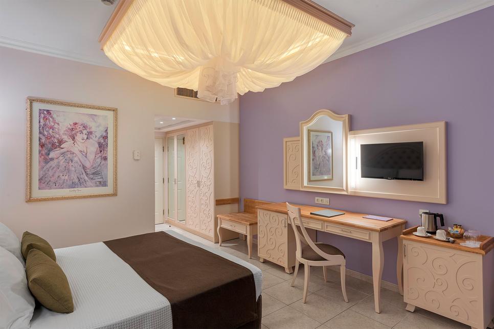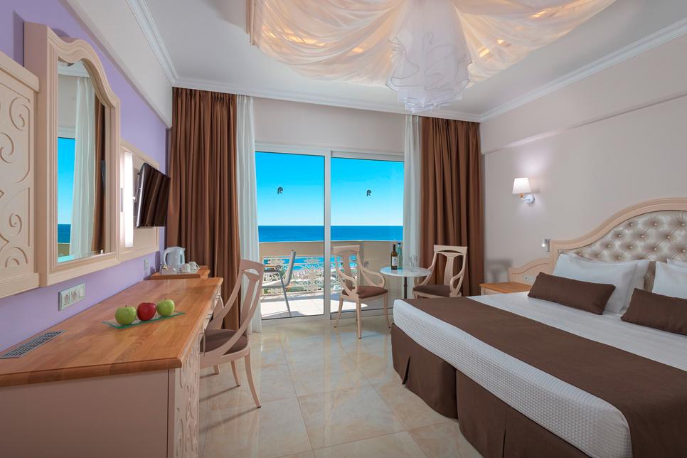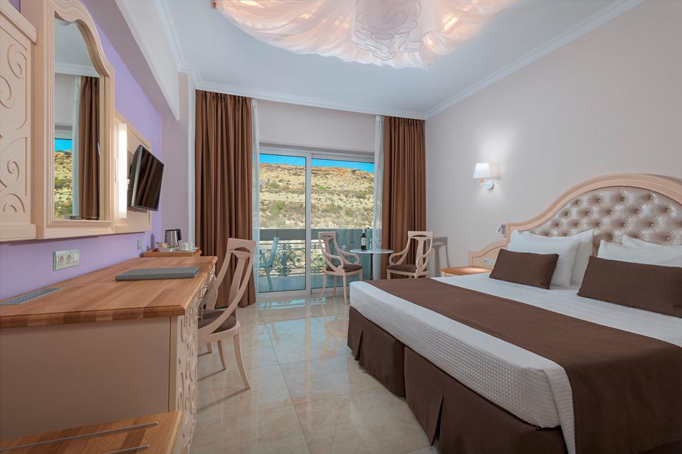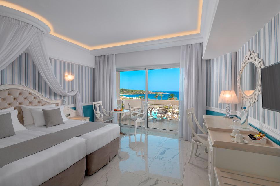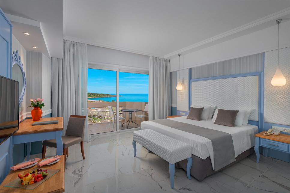 (env. 27-30 m²), 1 lit double ou 2 lits individuels, air conditionné, minibar* sur demande, réfrigérateur, Wifi, TV, téléphone, coffre-fort*, nécessaire à thé/café, petit réfrigérateur, chauffage, douche italienne, sèche-cheveux, peignoir, chaussons, nécessaire de bain, WC, balcon, vue mer, service du soir. Corbeille de fruits, service du soir.