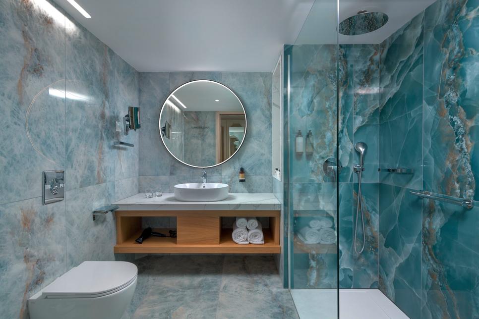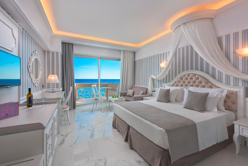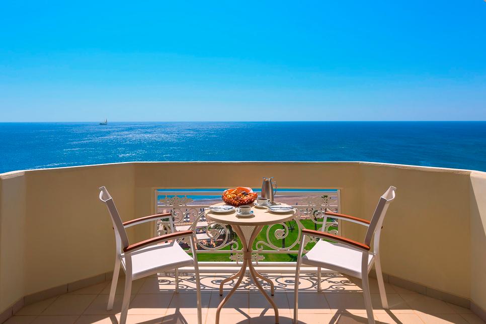 (env. 27 m²), 1 lit double ou 2 lits individuels, coin salon, air conditionné, minibar* sur demande, réfrigérateur, Wifi, TV, téléphone, coffre-fort*, nécessaire à thé/café, chauffage, douche italienne, sèche-cheveux, chaussons, nécessaire de bain, WC, balcon, vue mer.