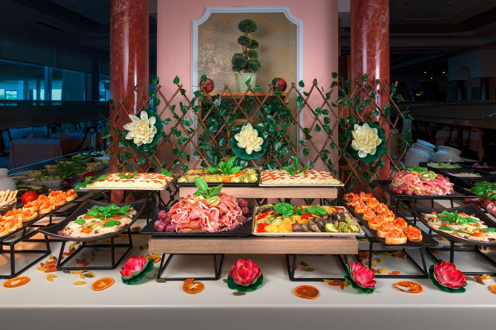 restaurant principal : « Symposium » cuisine internationale (restaurant buffet, pour petit-déjeuner, pour déjeuner, pour dîner, avec terrasse panoramique, soirée à thème (4 fois par semaine))