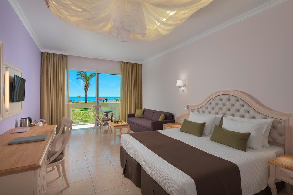 (env. 35 m²), 1 lit double ou 2 lits individuels et 1 canapé-lit, coin salon, air conditionné, minibar* sur demande, réfrigérateur, Wifi, TV, téléphone, coffre-fort*, nécessaire à thé/café, chauffage, baignoire, sèche-cheveux, chaussons, nécessaire de bain, WC, balcon, vue mer.