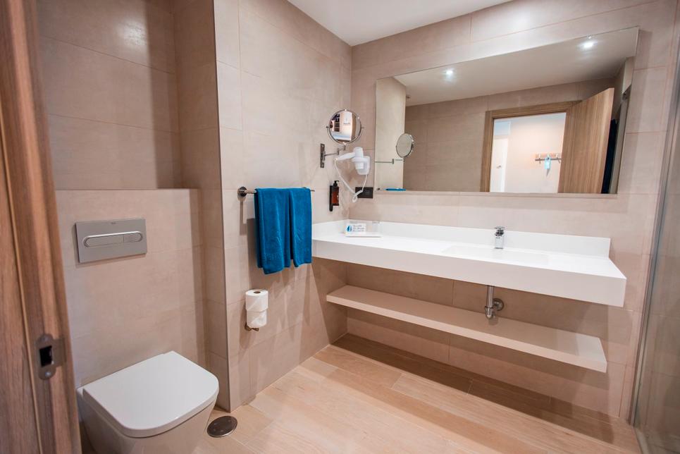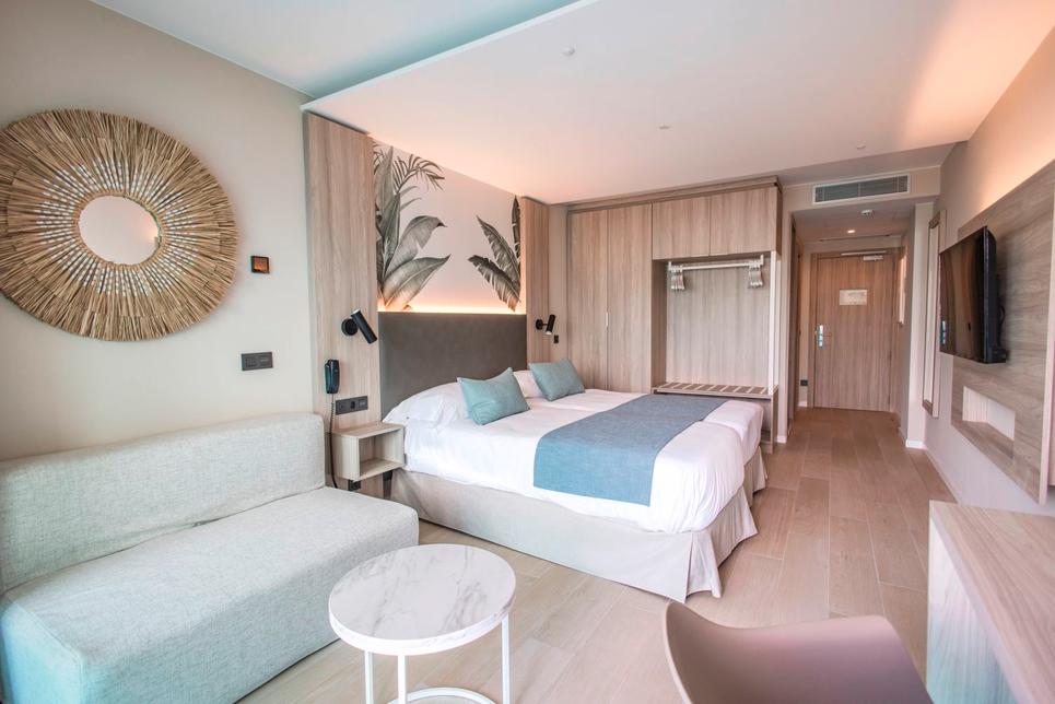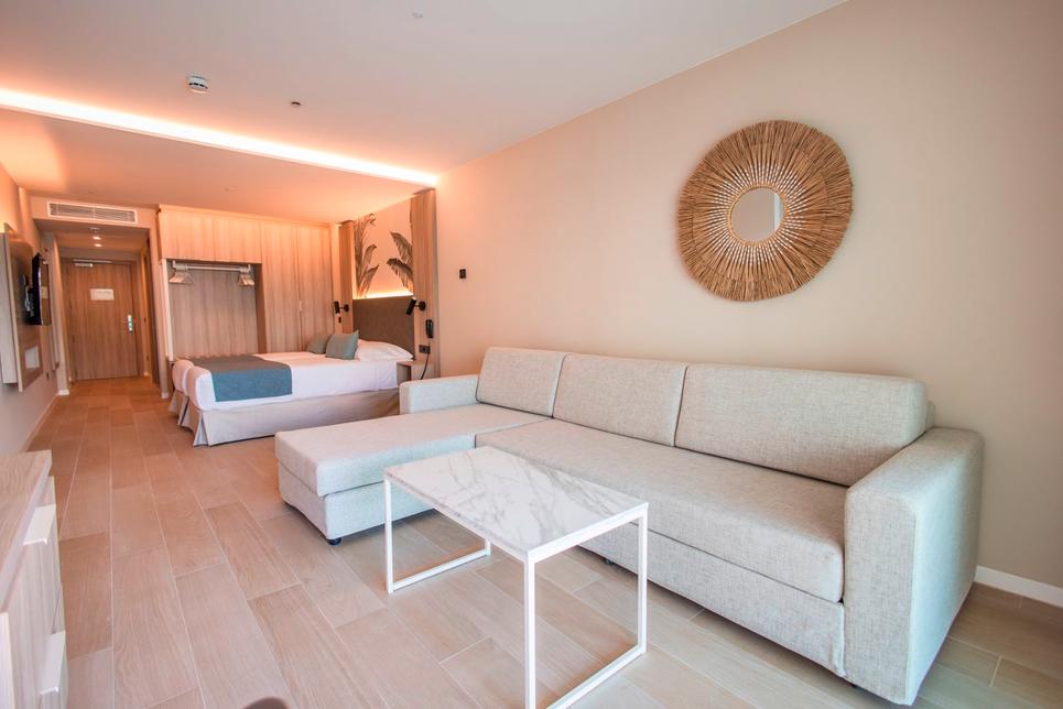(env. 34 m²), 2 lits individuels (90 x 200 cm), 1 coin salon (1 canapé-lit), air conditionné, minibar*, Wifi, TV, téléphone, coffre-fort*, bouilloire électrique, machine à café, petit réfrigérateur, douche, sèche-cheveux, miroir cosmétique, WC, terrasse, convient aux personnes allergiques. Terrasse équipée de chaises longues, avec accès direct à une piscine partagée.