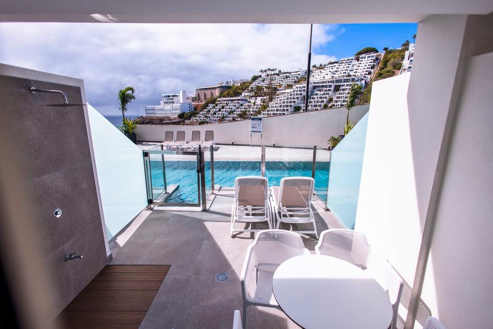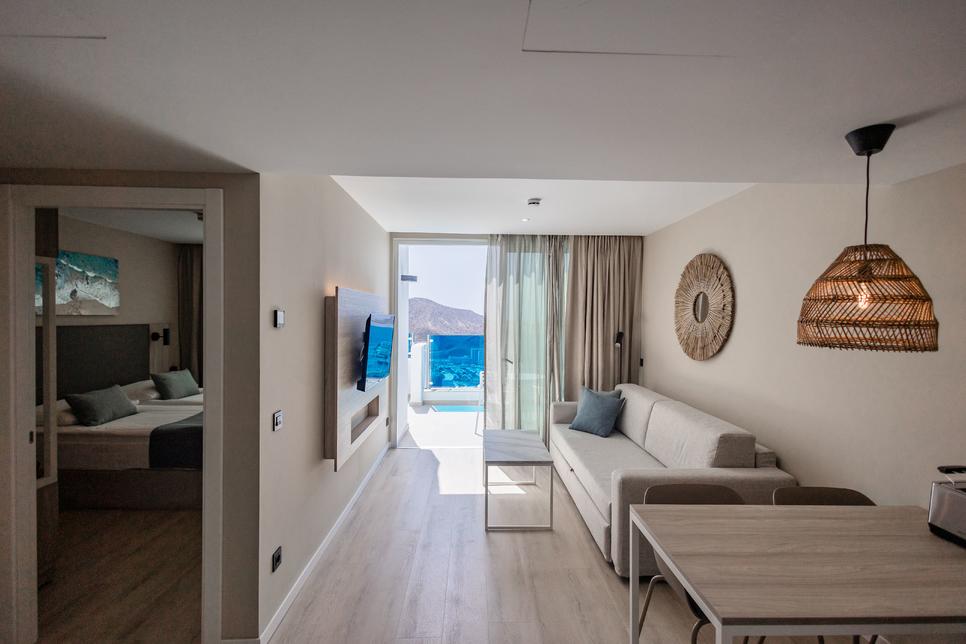 (env. 35 m²), 1 chambre au 1er étage : (2 lits individuels (90 x 200 cm)), 1 salon (1 canapé-lit, porte de séparation), air conditionné, minibar*, Wifi, TV, téléphone, coffre-fort*, bouilloire électrique, machine à café Nespresso, petit réfrigérateur, douche, sèche-cheveux, miroir cosmétique, draps de bain, WC, piscine privée, terrasse. Machine à glaçons, distributeur de boissons, terrasse équipée de chaises longues. Catégorie de chambres réservée aux clients dès 18 ans.