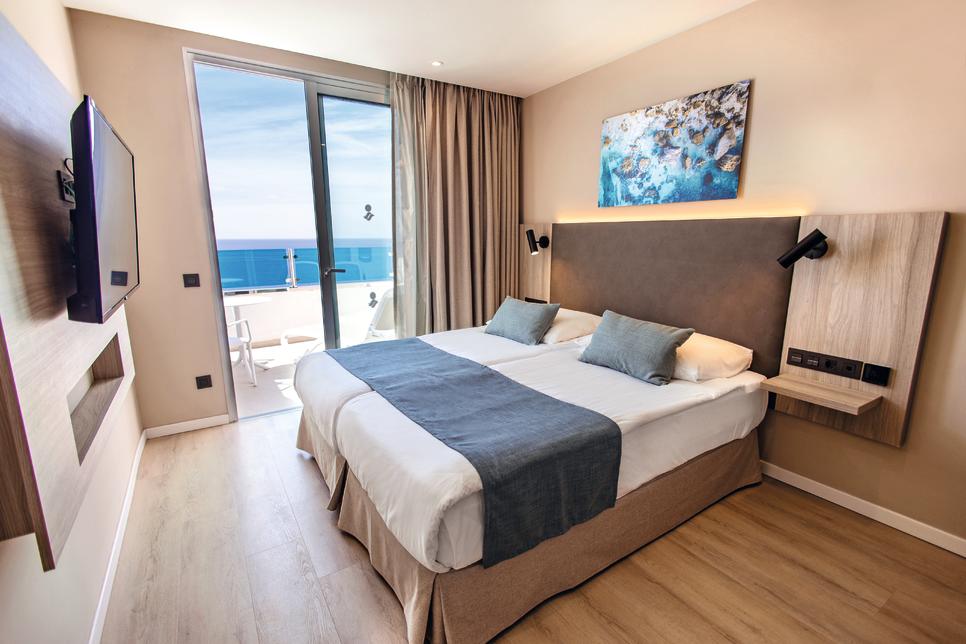 (env. 35 m²), 1 chambre (2 lits individuels (90 x 200 cm)), 1 séjour (1 canapé-lit, porte de séparation), air conditionné, minibar*, réfrigérateur, Wifi, TV, téléphone, coffre-fort*, kitchenette, four à micro-ondes, grille-pain, bouilloire électrique, machine à café, petit réfrigérateur, douche, sèche-cheveux, miroir cosmétique, WC, balcon, vue mer.