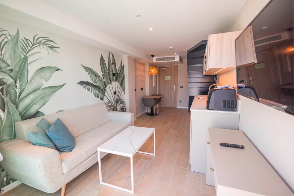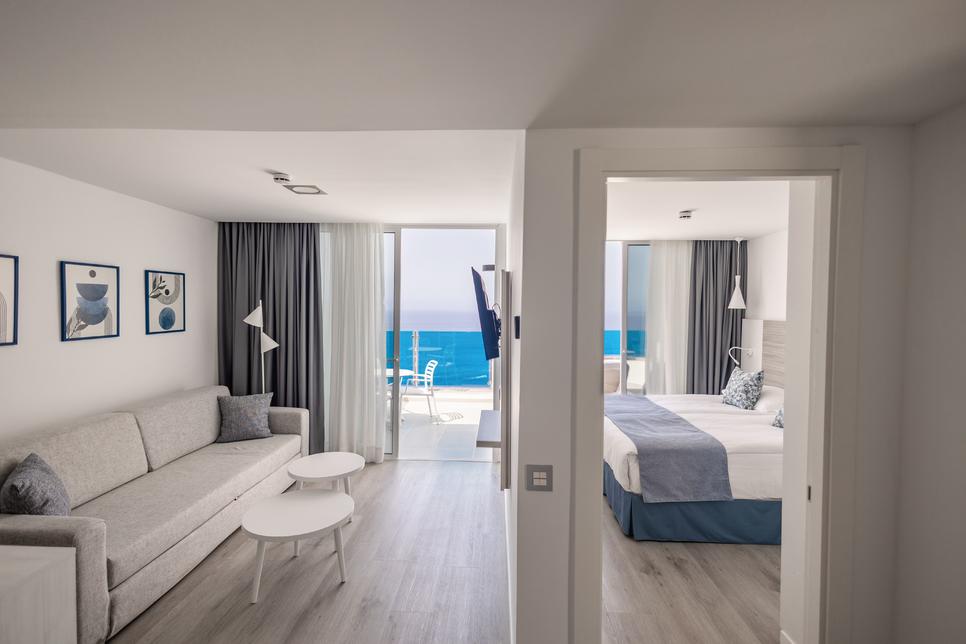 (env. 35 m²), 1 chambre (2 lits individuels (90 x 200 cm)), 1 séjour (1 canapé-lit, porte de séparation), air conditionné, minibar*, réfrigérateur, Wifi, TV, téléphone, coffre-fort*, kitchenette, four à micro-ondes, grille-pain, bouilloire électrique, machine à café, petit réfrigérateur, douche, sèche-cheveux, miroir cosmétique, WC, balcon ou terrasse. Vue mer restreinte.