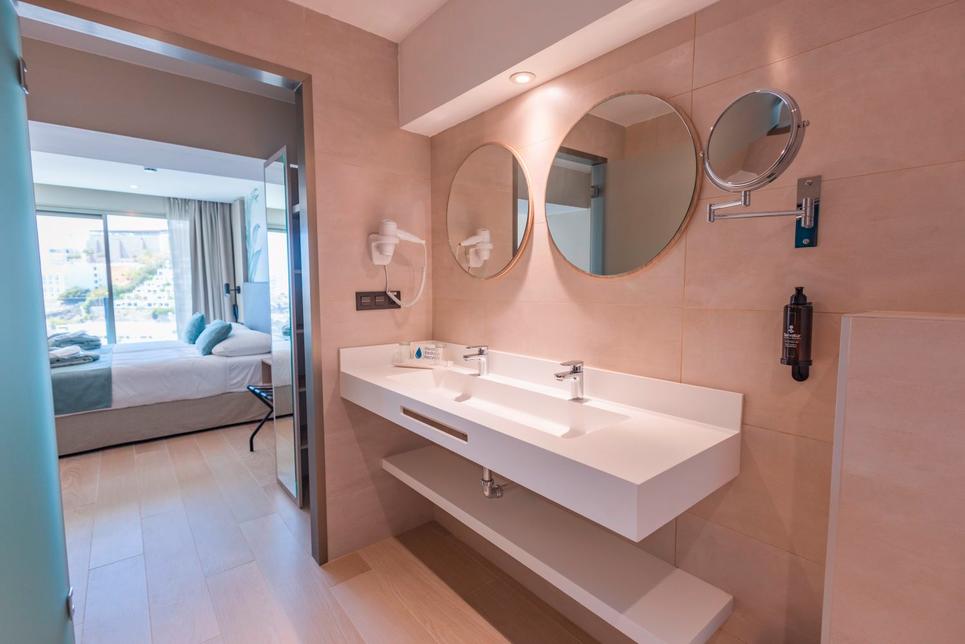 (env. 28 m²), 2 lits individuels (90 x 200 cm), 1 coin salon (1 canapé-lit), air conditionné, minibar*, Wifi, TV, téléphone, coffre-fort*, bouilloire électrique, machine à café, petit réfrigérateur, douche, sèche-cheveux, miroir cosmétique, WC, balcon ou terrasse, convient aux personnes allergiques. Vue mer restreinte.