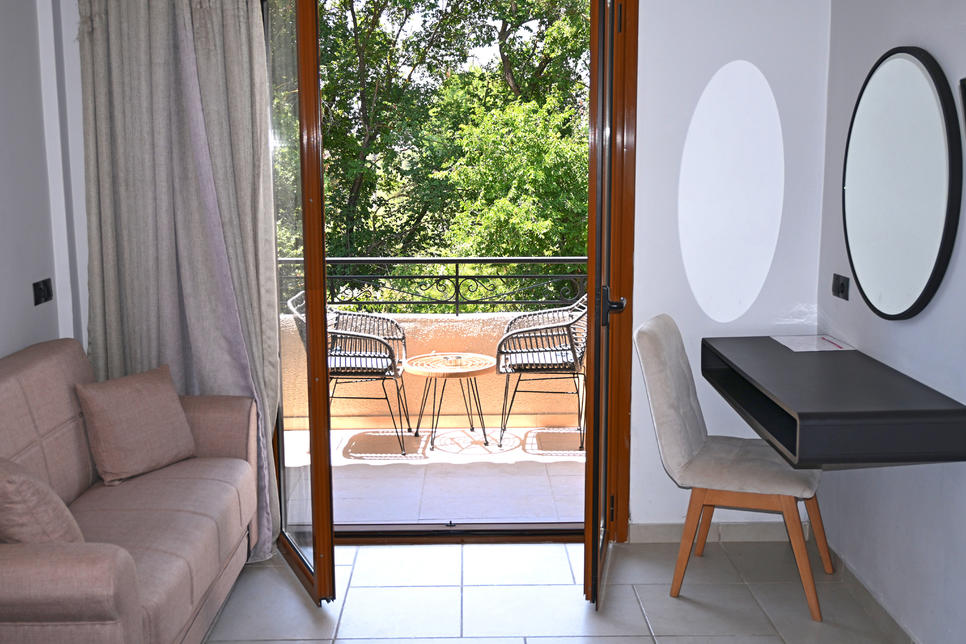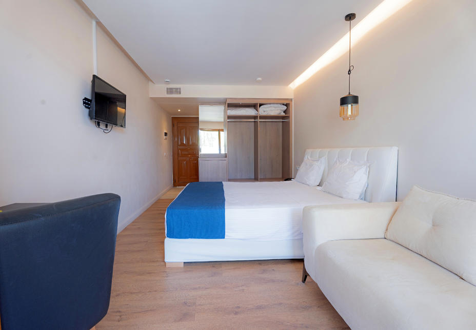 (env. 25 m²), rénovée en 2025, 1 lit king size, air conditionné, Wifi, TV, téléphone, coffre-fort, nécessaire à thé/café, petit réfrigérateur, chauffage (selon saison), douche, sèche-cheveux, miroir cosmétique, peignoir, nécessaire de bain, WC, vue mer latérale, fer et planche à repasser, bouteille d’eau à l’arrivée.